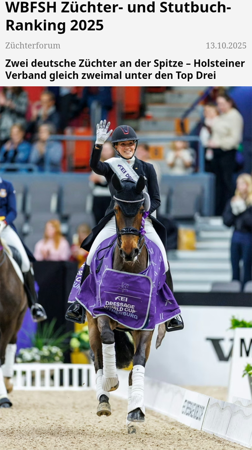aus dem Eis" Auch in diesem Jahr sorgt die letzte Tochter des Fidermark, gezeugt aus den letzten TG Reserven dieses grossartigen Hengstes, für Schlagzeilen: Im aktuellen WBFSH-Ranking der Dressurpferdezüchter steht Stephan Kurz aus Zöbingen, Baden-Württemberg, an der Spitze. Den herausragenden Erfolg verdankt er der Hannoveraner Stute Mount St John Freestyle v. Fidermark-Donnerhall. Unter der Dänin Cathrine Laudrup-Dufour glänzte die Stute bei den Europameisterschaften mit zweimal Einzelsilber und Mannschaftsbronze. |